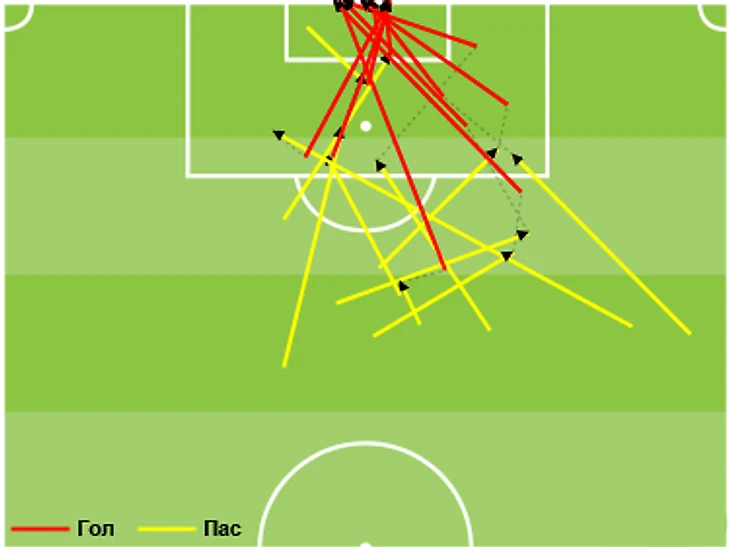 А для того, чтобы заметить отличия в комбинационной игре ЦСКА и «Динамо», вполне достаточно было включить телевизор в субботу днем, когда бело-голубые переигрывали красно-синих в химкинском дерби. Обе команды сделали примерно одинаковое количество точных передач – 310 у ЦСКА, 327 у «Динамо», но на разницу в качестве игры указывало число этих же передач в атакующей стадии, на чужой трети поля: ЦСКА – 58, «Динамо» – 81 (а также показатель точности – 49% и 60%). Кроме того, нападающие «Динамо» Воронин и Кураньи сделали друг другу в общей сложности 11 передач, а Думбия и Вагнер Лав – всего 5. Ладно, там было еще пять – посмотрите на рисунке, где именно.