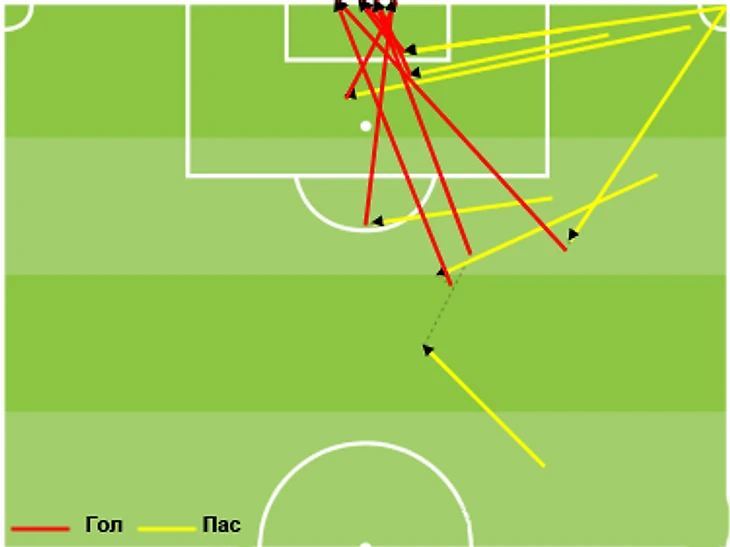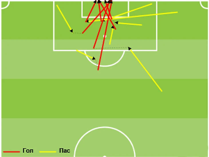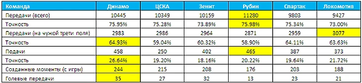 «Динамо» не является лидером по большинству командных показателей, но выделяется ровно там, где нужно. У команды Силкина самая высокая точность передач на чужой трети поля, внушительное количество подач (того, что в английском языке называется словом «кросс» – это может быть как навес на голову, так и прострел низом) и выдающаяся на фоне других фаворитов точность этих подач. Еще один любопытный показатель – количество длинных передач на чужой половине поля (в среднем 23 за игру), указывающее на разнообразие вариантов развития атаки: это либо переводы с фланга на фланг, либо дальние забросы (как правило, в исполнении Воронина) из центра поля на ход Кураньи и фланговым полузащитникам. Все это изобилие разных передач в конце концов сводится к одному весьма доступному факту: Александр Самедов и Андрей Воронин создали больше всего моментов с игры в текущем сезоне премьер-лиги (52 и 43), то есть отдавали передачи, после которых следовал удар по воротам (которых у «Динамо», конечно же, тоже больше всего – ровно 300).