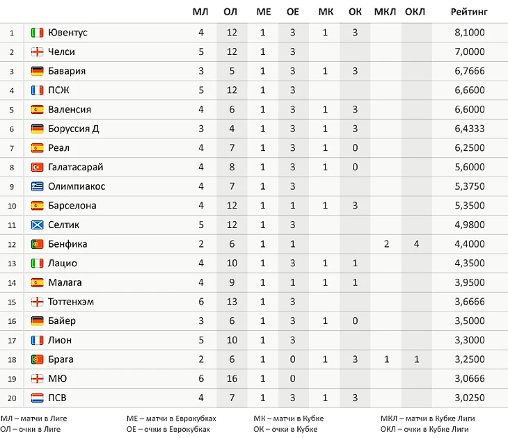 С великим сожалением отмечаем, что лучшие времена «Шахтера» в этом рейтинге, видимо, позади: сейчас команда Луческу теряет позиции из-за перерыва в чемпионате Украины, а вернуть их будет чрезвычайно тяжело – ведь в Лиге чемпионов «горнякам» досталась дортмундская «Боруссия».