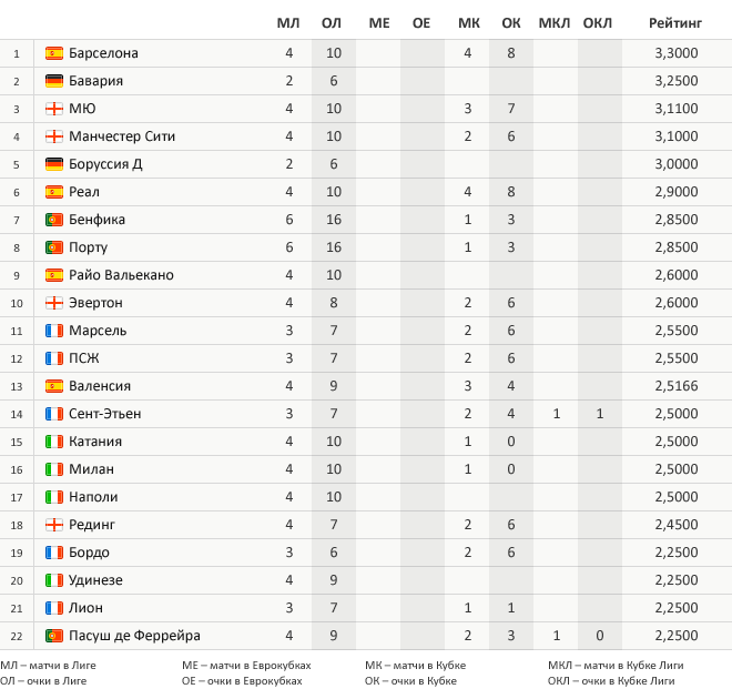 Дортмундская «Боруссия», мадридский «Реал», «Порту» и «Бенфика» присутствуют в нашем топе более-менее постоянно, а вот на девятом месте неожиданно образовался «Райо Вальекано», благодаря четырем победам в пяти матчах дорогостоящего чемпионата Испании набравший 2,6 балла. Столько же набрал еще один дебютант, мерсисайдский «Эвертон», ведомый Лейтоном Бэйнсом и Маруаном Феллэйни – будущими героями летнего трансферного периода.