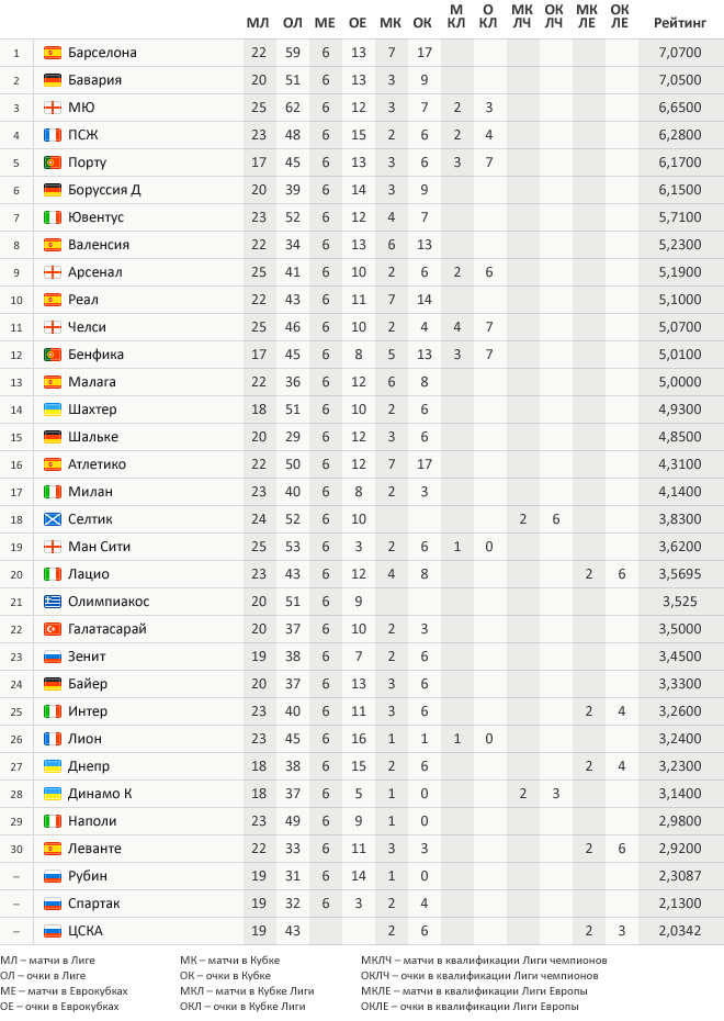 Общий зачет тем временем выглядит все более и более объективно: пять верхних строчек занимают пять лидеров ведущих европейских лиг. Шестого лидера, «Ювентус», в элиту не пускает дортмундская «Боруссия», сильно лучше туринцев отыгравшая матчи января.