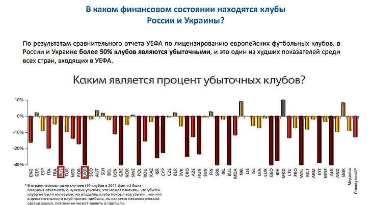 Когда Газзаева начали усердно забрасывать новыми вопросами про главу РФС, его спокойствие пошатнулось: «Меня он совершенно не интересует. Что мне с ним, детей нянчить?». Слайды, которые медленно проскальзывали по экранам за спиной Газзаева, пестрели графиками о плачевном положении российской футбольной экономики: 82% бюджетов команд формируются прямыми вливаниями денег, без заработка; около 5 процентов доходов наших клубов – по статье Matchday (тогда как в Европе на этом получают не меньше 20%); телеаудитория чемпионата России уменьшилась в три раза с 2008 года; объем рекламного рынка России на два миллиарда евро опережает итальянский, но премьер-лига получает меньше серии А; процент убыточных клубов – на уровне Грузии, Албании, Польши и Эстонии.