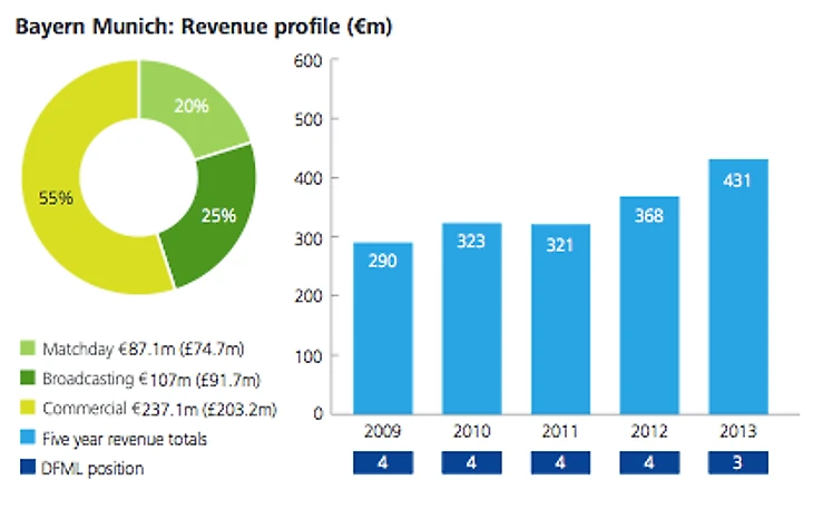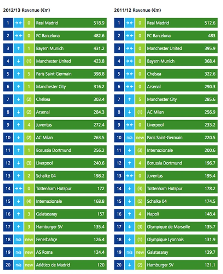 В этом году в рейтинге случилась маленькая революция – «Манчестер Юнайтед» потерял третье место, уступив его «Баварии», и впервые за всю историю рейтинга вылетел из группы лидеров. Правда, составители рейтинга призывают не разглядывать здесь какие-то признаки системных проблем «МЮ» – дело в первую очередь в блистательном сезоне «Баварии». Удачное выступление мюнхенцев в Лиге чемпионов увеличило их доходы от продажи медиаправ аж на 31 процент. В сумме же доходы «Баварии» выросли на 17 процентов.