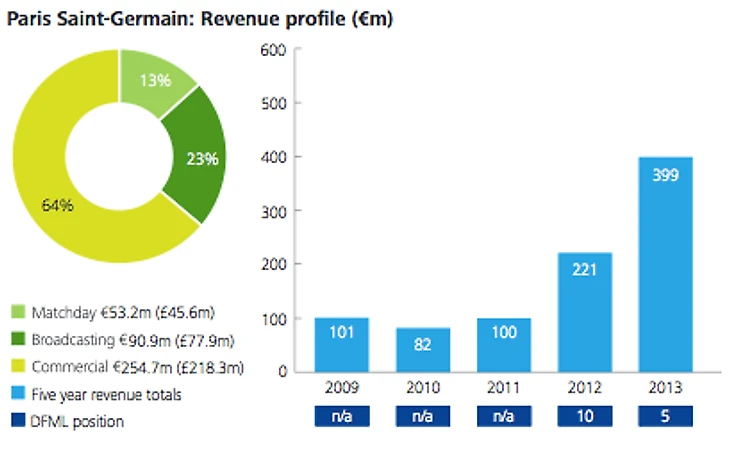 Поразительный результат показал «ПСЖ», который ворвался в пятерку самых богатых клубов мира, перепрыгнув через головы таких гигантов, как «Арсенал», «Челси» и «Манчестер Сити». Еще в 2011 году парижан вообще не было в первой двадцатке, в 2012-м они стали десятыми, а уже на второй год пробились в настоящую элиту. Дело, конечно же, в коммерческих соглашениях, которые принесли «ПСЖ» – внимание – 254,7 млн евро. Это 64 процента от всех доходов клуба и абсолютный мировой рекорд в области футбольных сделок. Такие невероятные деньги «ПСЖ» принесли контракты с Emirates, Nike, Qatar Tourism Authority, Panasonic, McDonalds, Microsoft.