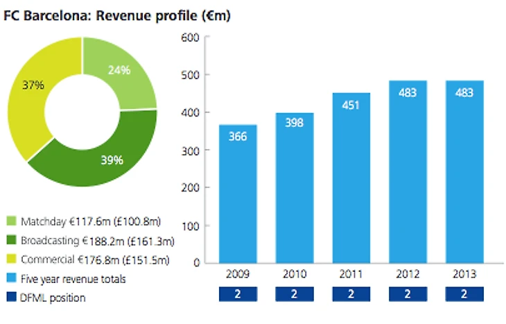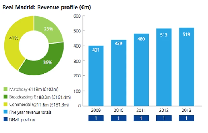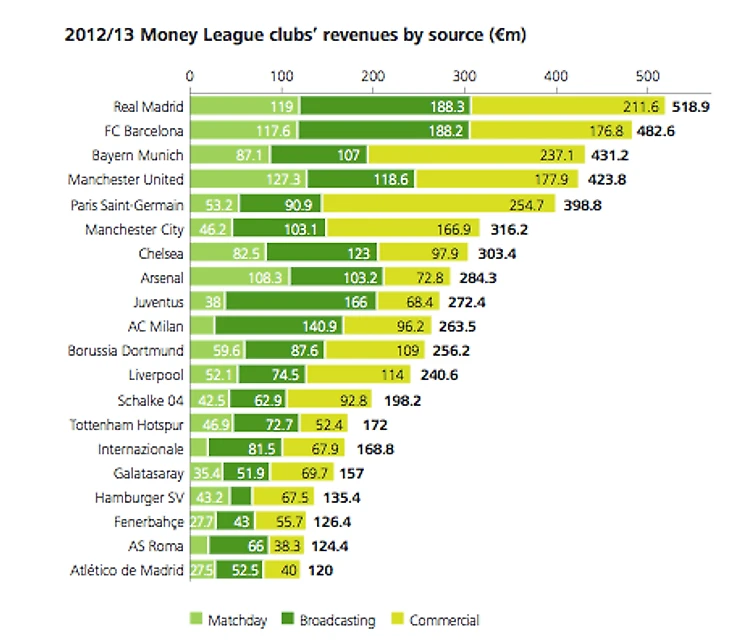 Matchday1. «Манчестер Юнайтед» – 127,3 млн евро2. «Реал» – 119 млн евро3. «Барселона» – 117,6 млн евро4. «Арсенал» – 108,3 млн евроМедиаправа1. «Реал» – 188,3 млн евро2. «Барселона» – 188,2 млн евро3. «Ювентус» – 166 млн евро4. «Милан» – 140,9 млн евроCommercial1. «ПСЖ» – 254,7 млн евро2. «Бавария» – 237,1 млн евро3. «Реал» – 211,6 млн евро4. «Манчестер Юнайтед» – 177,9 млн евро