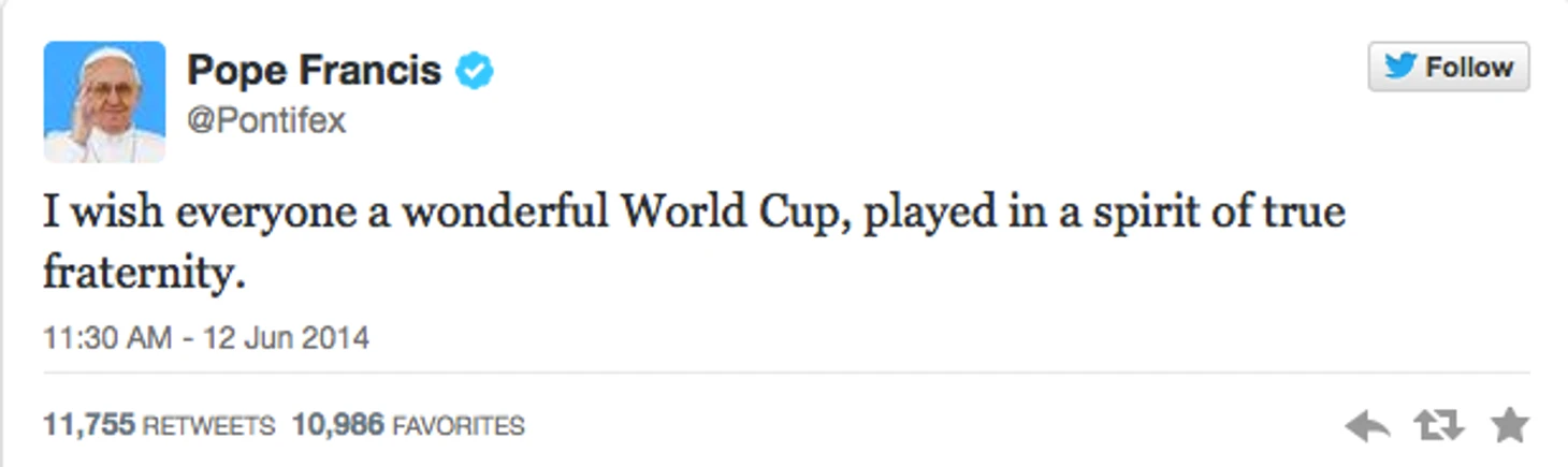 21.10 Начала ЧМ-2014 ждут даже в Ватикане. Папа Римский коротает время написанием твита и желает всем приятного, замечательного чемпионата мира. Взаимно!