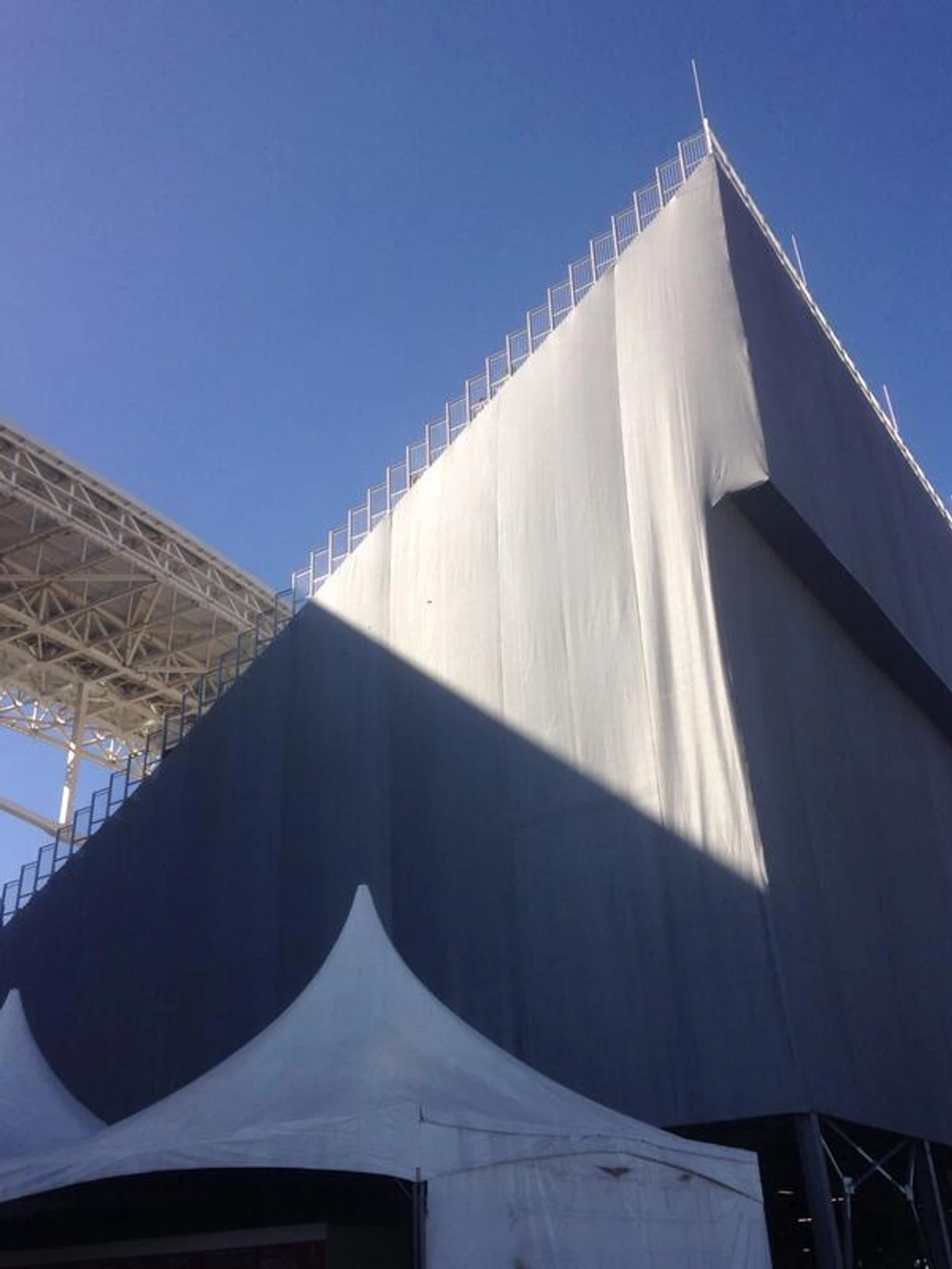 22.14 Александр Шмурнов недоволен отделкой трибун стадиона в Сан-Паулу: «Это, конечно, архитектурный писк: стена трибуны просто затянута холстиной».