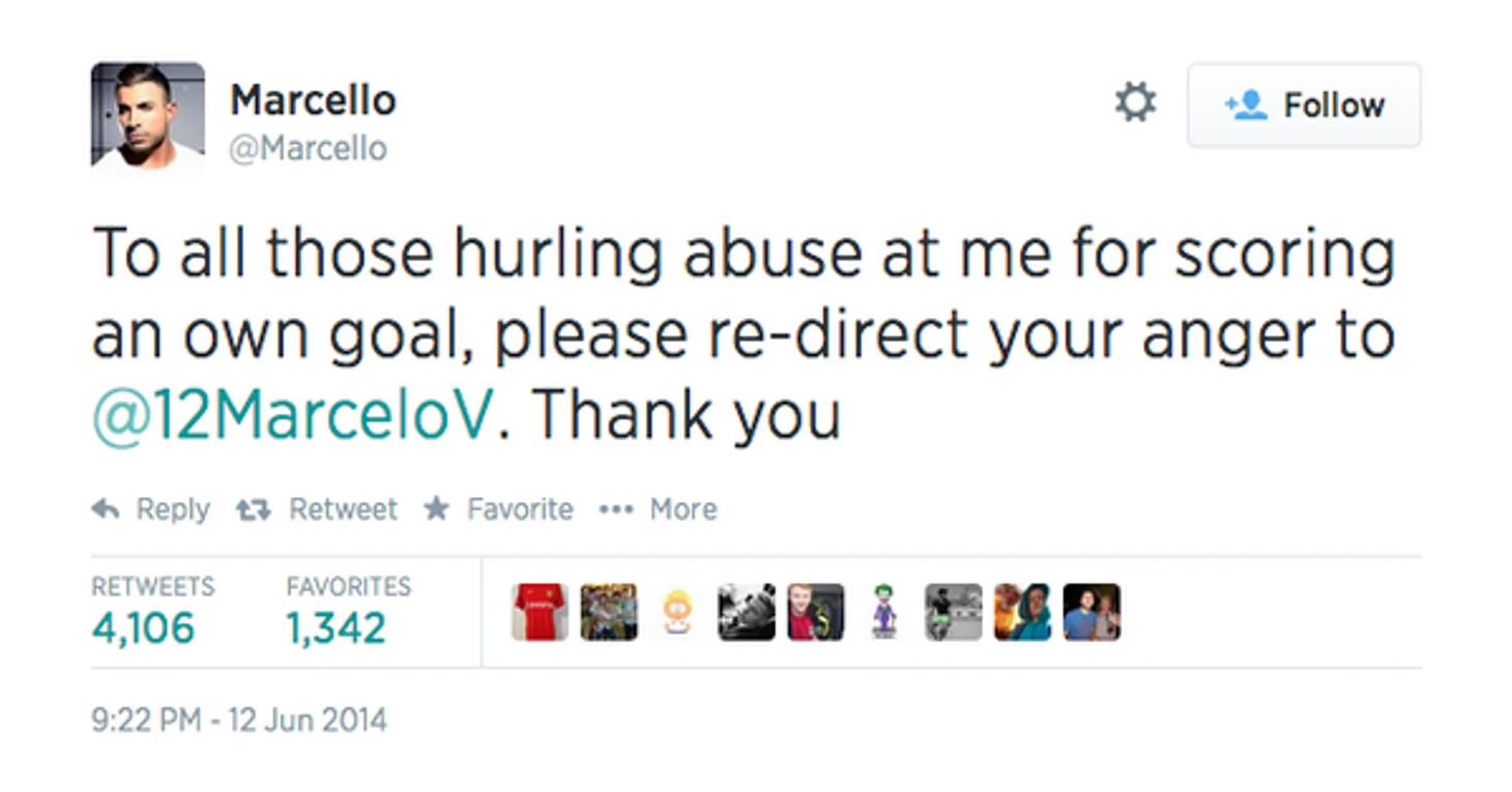 02.20 Удивительная история приключилась с одним из пользователей твиттера, которому не повезло в этот вечер иметь ник Marcello. Фанаты, разозленные автоголом левого бразильского защитника, начали писать ругательства в адрес этого человека, на что получили тактичный ответ со ссылкой на правильный аккаунт. «Пожалуйста, направляйте свою агрессию в адрес настоящего Марсело. Спасибо».