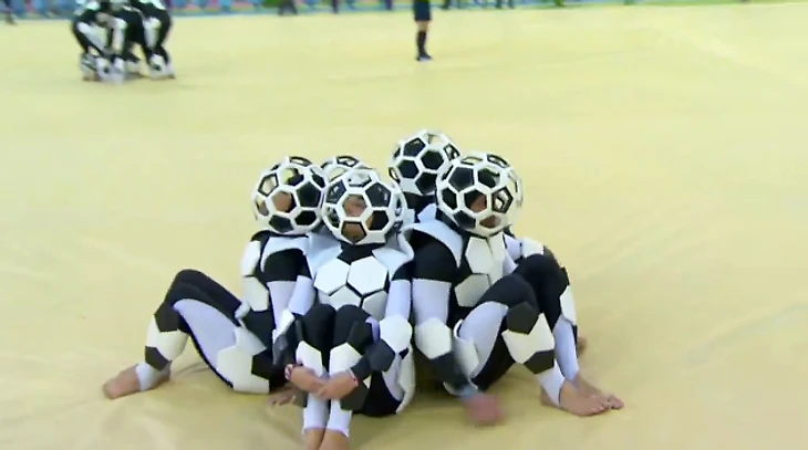 22.34 Тут же появляется футбольный мотив: маленькие судьи показывают артистам красные карточки, и на сцены выбегают футбольные мячи. Уф...