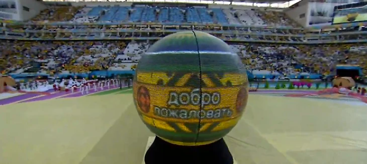 22.16 В центре «Арены Коринтианс» заработал большой мяч, который приветствует всех на языках стран-участниц ЧМ-2014. Есть и русский вариант.