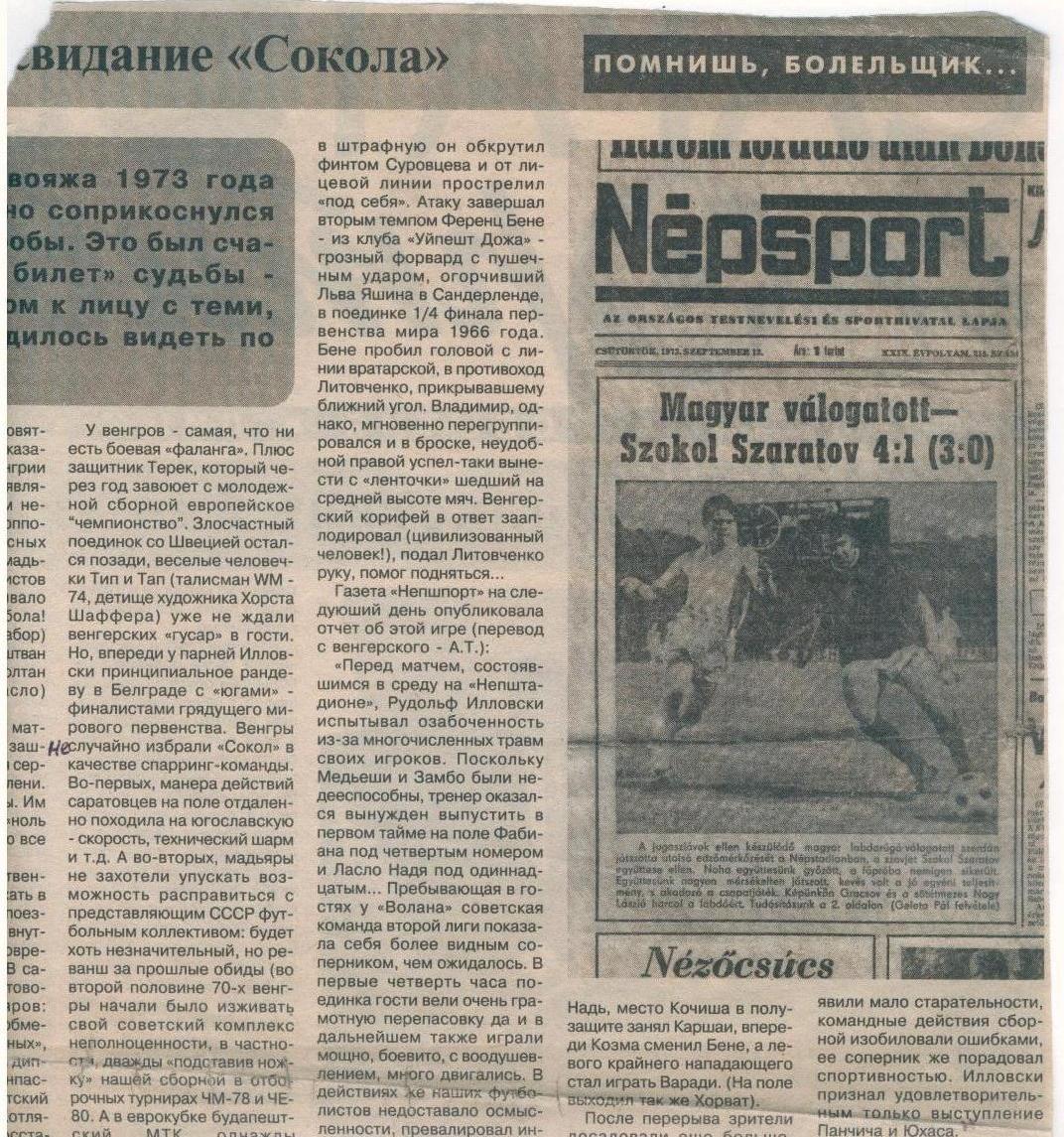 В сентябре 1973 года саратовскому «Соколу» выпал случай встретиться с плеядой самых ярких светил в галактике игры. Случилось это во время турне «Сокола» по Венгрии.