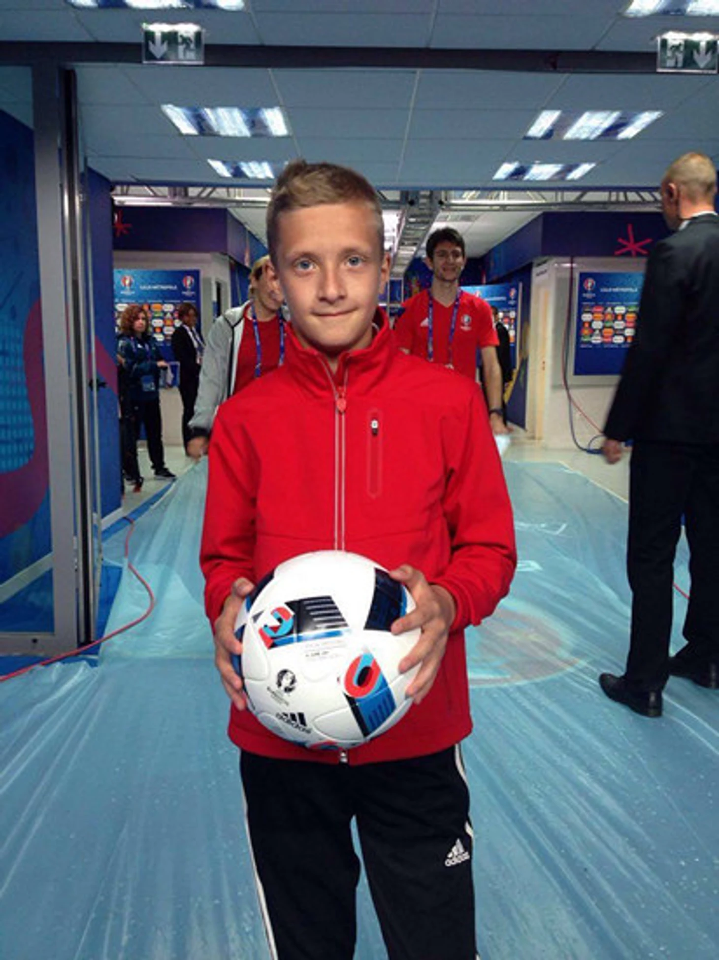 15 июня на стадионе «Пьер Моруа» в Лилле прошел матч Евро-2016 между Россией и Словакией. Перед его началом официальный мяч чемпионата вместе с арбитром вынес на поле 11-летний защитник ДЮСШ «Химки» Михаил Андрюшков, победитель конкурса «Юный арбитр KIA».