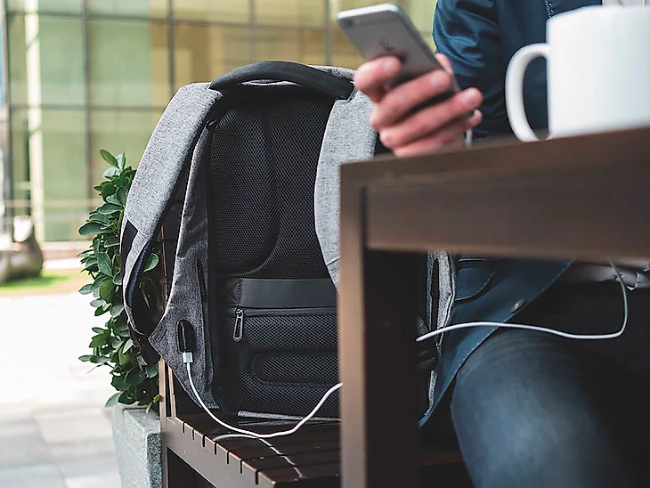 • С Bobby можно заряжать смартфон на ходу, быстро и без возни с повербанком. В рюкзак встроен USB-кабель, который выходит наружу под правой лямкой, а внутри предусмотрен отсек для внешнего аккумулятора. Очень удобно.