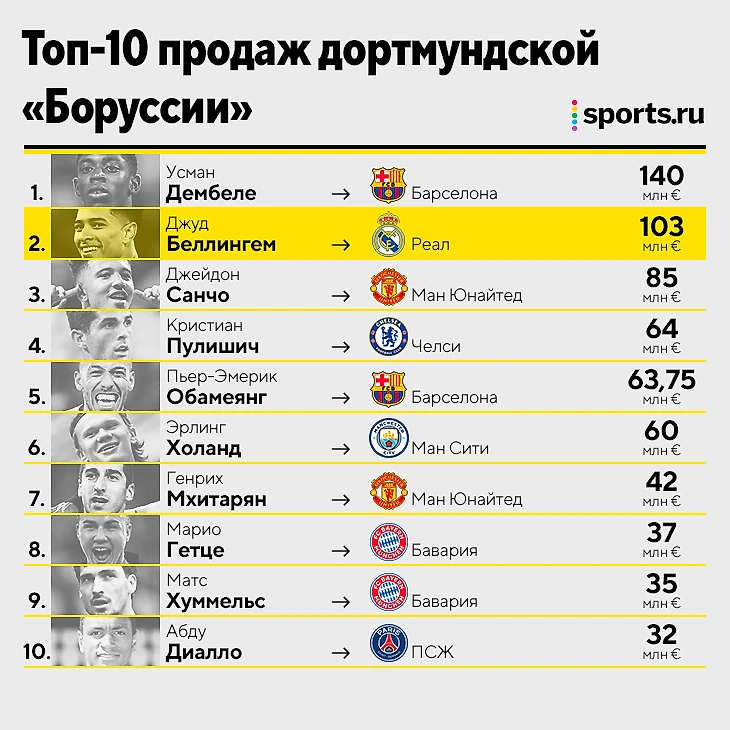 Это не рекордная продажа «Боруссии», но выгоднее только один трансфер. Вот как выглядит десятка: