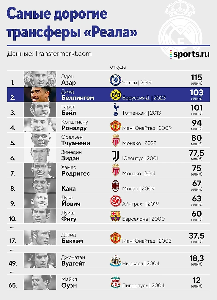 И да, получается, что один Беллингем стоит больше, чем Бекхэм, Оуэн и даже Джонатан Вудгейт вместе взятые (со всеми оговорками про другие времена и инфляцию).