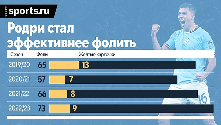 Косвенным отражением прогресса Родри служит соотношение фолов к желтым карточкам. Для «Сити» это особенно важно, так как 60% фолов команда совершает в первые 8 секунд после потери – наибольшая пропорция в АПЛ. То есть в конкретном случае это не просто показатель заряженности на борьбу, но и тактический инструмент: