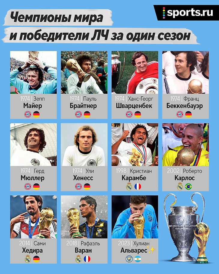 Первыми были немцы Зепп Майер, Пауль Брайтнер, Франц Беккенбауэр, Ханс-Георг Шварценбек, Герд Мюллер и Ули Хенесс – в 1974 году они сначала принесли «Баварии» первый Кубок чемпионов, а через 7 недель стали чемпионами мира.