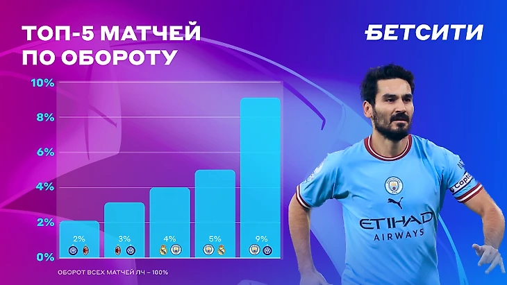 Самым популярным клубом среди игроков БЕТСИТИ ожидаемо стал победитель турнира — «Манчестер Сити». «Горожане» очаровали своей игрой всех любителей футбола и заслуженно добились успеха. Оборот ставок на их матчи достиг 15%. Другой финалист – «Интер» — получил 12% от оборота на всех участников ЛЧ. Тройку замкнул «Реал» с 10%.