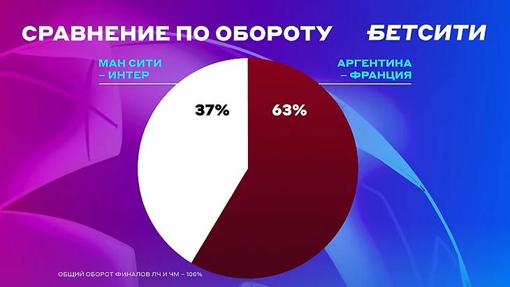 Также сравнили по обороту два главных матча этого сезона — финалы чемпионата мира и Лиги чемпионов. Эпичный поединок Аргентины и Франции вызвал у игроков больший интерес. На него ставили на 26% больше, чем на «Манчестер Сити» — «Интер».