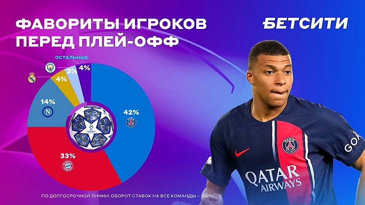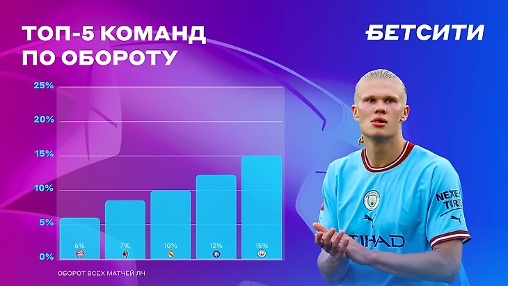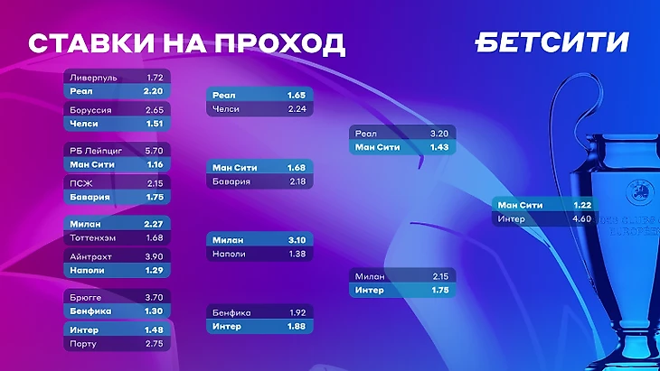 Перед стартом плей-офф победа «Ман Сити» в турнире была не так очевидна. До этого клуб ни разу в истории не завоевывал главный европейский трофей. Фаворитами игроки БЕТСИТИ видели «ПСЖ» и «Баварию». На них пришлись 75% ставок в долгосрочной линии на победителя ЛЧ. Тройку замкнул «Наполи» Хвичи Кварацхелии — 14%.