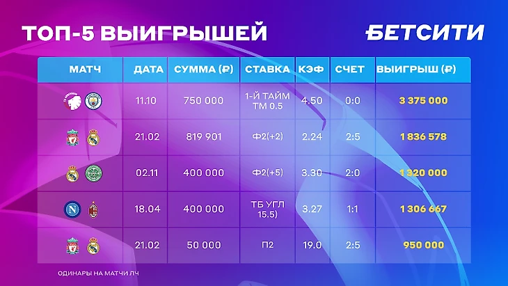 Делимся также самыми крупными победами игроков. Возглавил список выигрыш с матча группового этапа «Копенгаген» — «Манчестер Сити» (0:0). Игрок БЕТСИТИ поверил в то, что команда Гвардиолы не распечатает ворота датчан в первом тайме и поставил 750 000 рублей на ТМ 0.5. Коэффициент — 4.50. «Горожанам» пришлось помучаться в Дании. На 25-й минуте Рияд Марез не реализовал пенальти, а еще через пять минут гости остались в меньшинстве. «Копенгаген» героически удержал нулевую ничью, а игрок БЕТСИТИ стал богаче на 3 375 000 рублей.