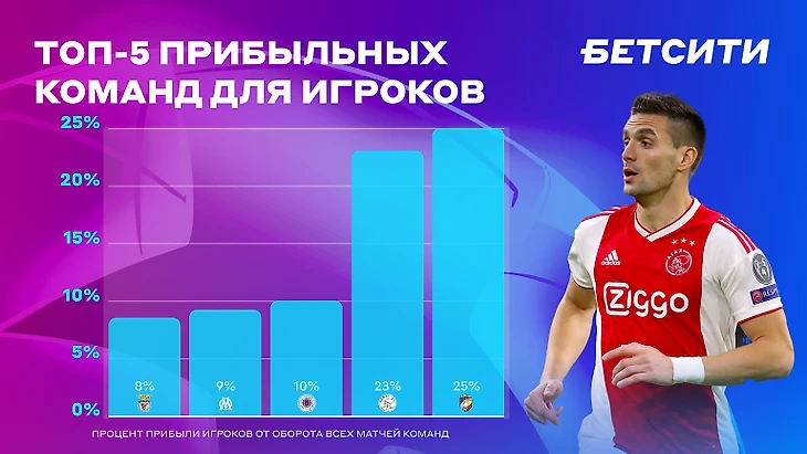 Самыми прибыльными для наших игроков БЕТСИТИ стали «Виктория Пльзень» и «Аякс». Чешский клуб попал в «группу смерти» с «Баварией», «Интером» и «Барселоной» и вылетел, не набрав ни одного очка. Зато бетторы обогатились на их матчах на 25%. «Аякс» проявил себя чуть ярче: дважды обыграл «Рейнджерс» и с третьего место в группе отправился в Лигу Европы. Игроки БЕТСИТИ переиграли букмекера на встречах голландского клуба на 23%.