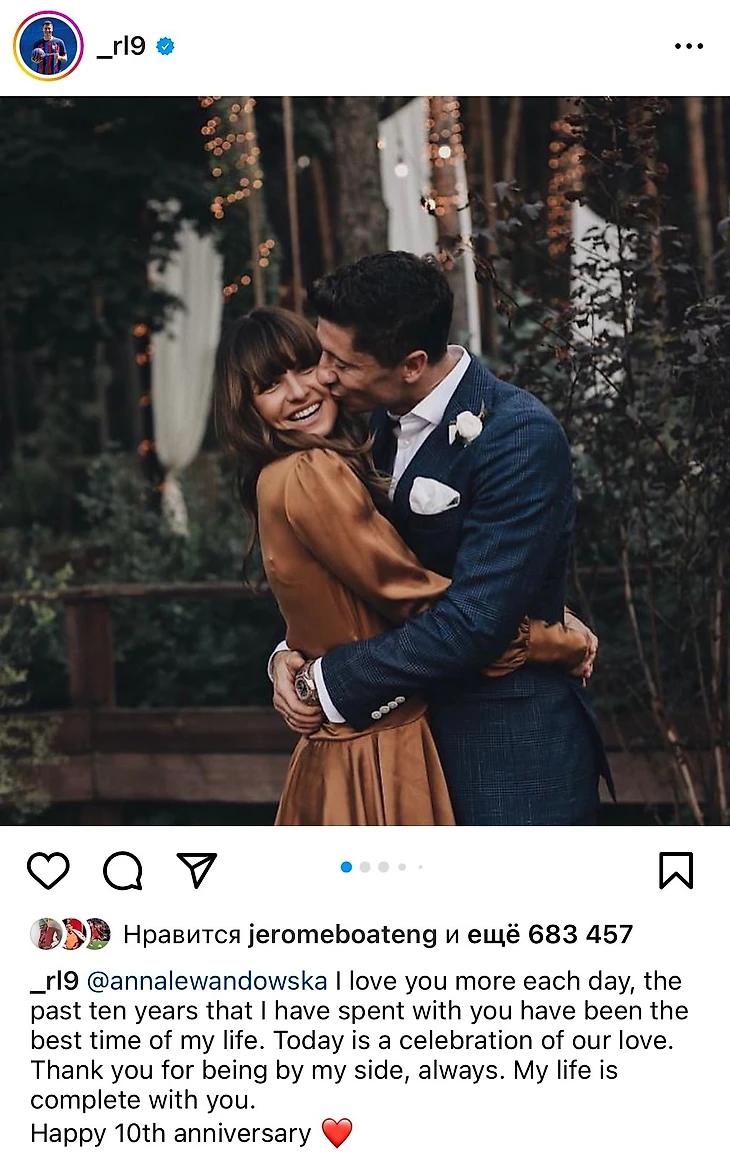 Левандовски отмечает 10-летнюю годовщину свадьбы с его женой Анной. Этой значимой дате Роберт посвятил милый пост в соцсетях: