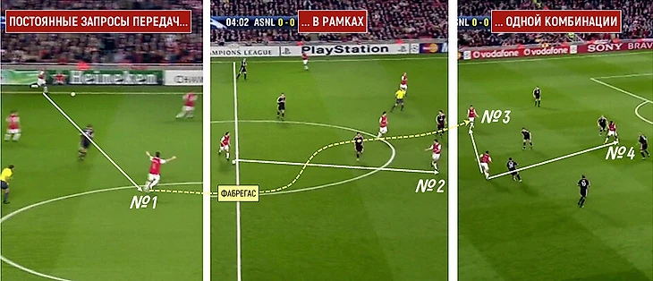 Так мяч сначала визуально прогонялся по маршруту Клиши-Фламини-Фабрегас-следующий игрок, и только затем передавался в реальном времени. Это просто, но особенно эффективно в тех случаях, когда внедрено до степени инстинкта: в момент входящей передачи собиралась информация для следующего паса, сверялись риски, фотографировались позиции.