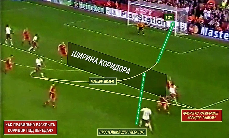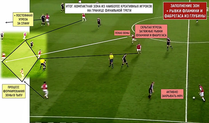 Проблема в том, что такие передачи должны быть достаточно сильными, жесткими для обработки, чтобы проходить. Часто первый игрок просто останавливал их для второго (мастером таких обработок, микросбросов в касание был Адебайор). Но в идеале «Арсенал» предпочитал нашпиговать эту зону креативными полузащитниками, которые обладали великолепными данными по предоценке окружающего пространства, умели сбрасывать с плеч/спины первичное давление, играть в острое первое касание на приеме и отправлять следующий разрезающий пас за спину под рывок.