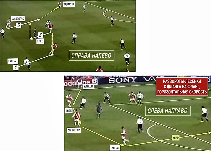 «Арсенал»-2007/08 рисковал значительно чаще среднестатистической команды. Но игроки стремились упростить друг другу жизнь циркулирующим движением. Верхняя часть изображения отлично это иллюстрирует: перед Глебом плотная сцепка из двух соперников. Александр начинает двигаться к левой бровке, а параллельно ему движение дублирует и Фабрегас, стремясь выйти из тени. Совместное и, казалось бы, простейшее улучшение диспозиции эпизода работает.