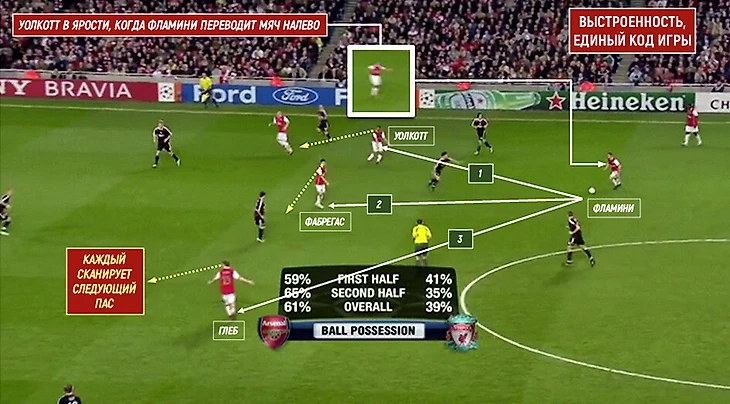 Все трое (Тео, Сеск, Глеб) показывают жестами, что готовы принять мяч от Фламини. Каждый из них оценивает ситуацию вокруг, бросая взгляд через плечо. Уолкотт обычно начинал ведение после получения таких передач, Сеск смотрит на Глеба, взгляд Александра направлен в глубину поля. Еще не получив пас (тот в стадии обдумывания у Фламини), все они уже готовят следующее действие. Если в футболе вообще применимо слово «телепатия», то это она.