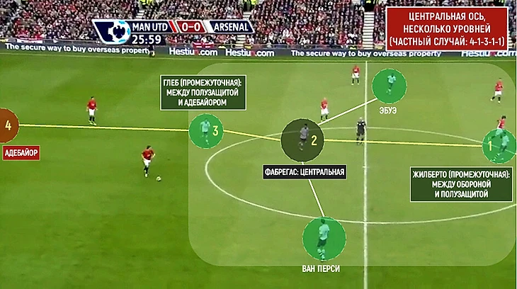 Уровень № 1 по центральной оси представлен Жилберто (обычно Фламини). Выше (2) располагается Фабрегас, который связывает центральную ось с флангами. На уровне № 3 – промежуточная креативная единица в лице Глеба. Выше него – форвард Адебайор (4).