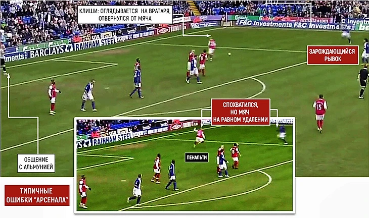Мяч под контролем Клиши (основное изображение), но француз поворачивает голову в сторону своих ворот (влево). В это мгновение он упускает зарождающийся рывок игрока соперника с фланга. Так зачем оглядываться на вратаря? Объяснение только одно: Гаэль хотел проверить, не хочет ли Альмуния выйти из ворот и забрать мяч, чтобы убить еще немного времени в напряженной концовке. Тем временем мяч уже на равном удалении от Клиши и рванувшего в штрафную площадь игрока «Бирмингема». Стык, пенальти и нервный срыв капитана Галласа.