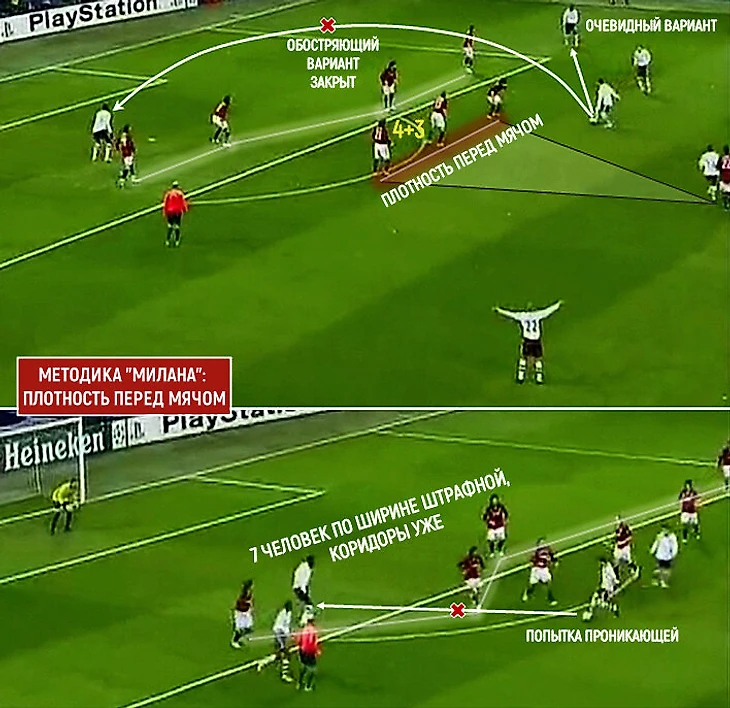 Вверху тройка полузащитников «Милана» в знаменитом ромбе 4-3-1-2 занимает максимально плотные позиции. Так как эпизод происходит на границе штрафной, то и расстояние между линиями минимальное. Фабрегас вынужден пасовать на фланг.