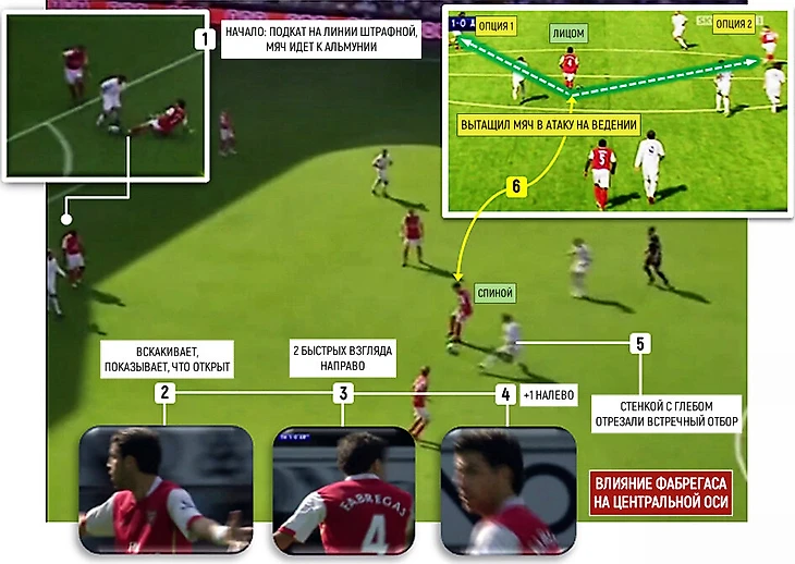 Сначала отрабатывает в обороне, выполняя чистый подкат под Робби Кина у границы штрафной «Арсенала» (1). Мяч уходит к Альмунии в руки. Сеск мгновенно поднимается, показывает вратарю, что открыт для ввода мяча (2). Понимая, что голкипер сейчас вернет ему мяч, Фабрегас уточняет положение вокруг себя: два быстрых взгляда через правое плечо (3), один влево от себя (4). Убедившись, что угроза может прийти только сзади, в касание отыгрывается с Глебом в стенку, отсекая прессинг в спину (5).