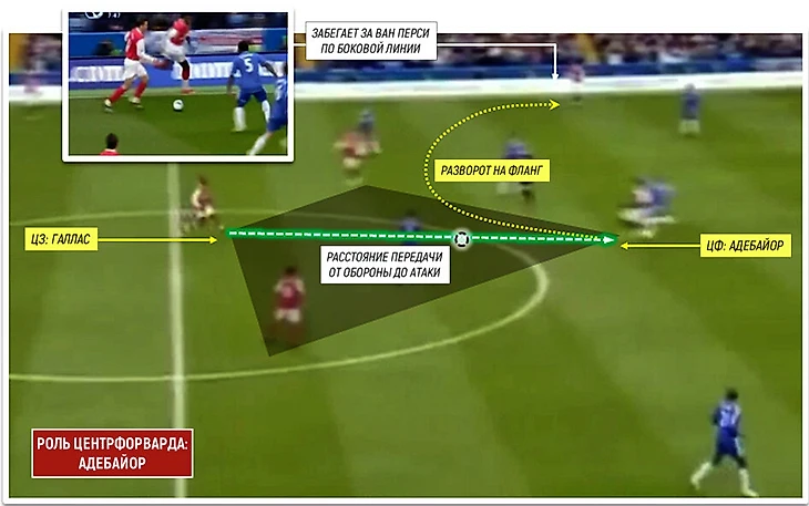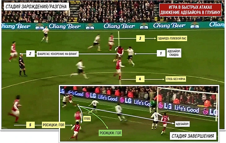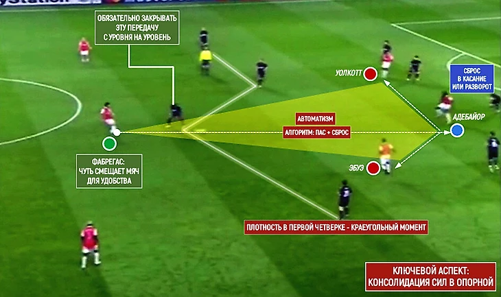 Механизм работал на любом участке поля, но наиболее эффективен был на входе в штрафную площадь. Он был отработан до автоматизма: на Фабрегаса выдвигается соперник, тот смещает мяч чуть вправо и рассекает линию. У Адебайора три варианта: Уолкотт, Эбуэ + собственный разворот лицом к воротам за счет первого касания и мощи.