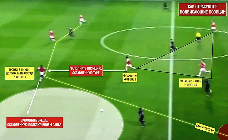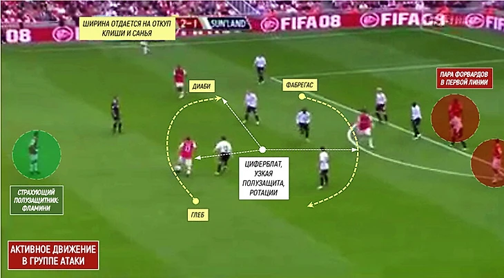 Фламини вне кадра, но и он чаще находился выше. Тогда «Арсенал» фактически мог играть в 4 центральных полузащитника на расстоянии короткой-средней передачи. Хотя вариант выше можно назвать радикальной интерпретацией, обычно в центр смещался кто-то один (чаще Глеб).