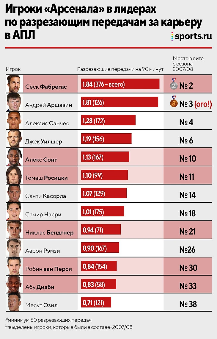 Сеск был лучшим в этом деле, но вся философия «Арсенала» была построена на таком типе передач. И тренировки, и стиль, и селекция были направлены на максимизацию этого навыка (даже у неочевидных кандидатов – привет Сонгу и Бендтнеру). В таблице игроки «Арсенала», которые выделяются в этом отношении в масштабах истории АПЛ. Выделены те, кто был в команде-2007/08:
