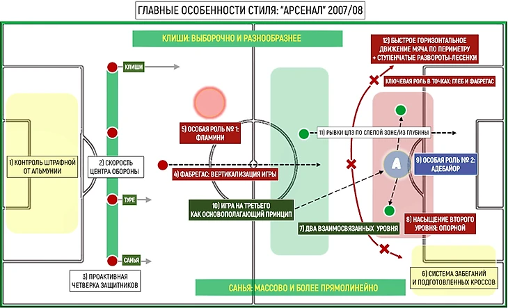 Чужая опорная зона (зона «десятки») была местом, куда умышленно целился «Арсенал». Там всегда готовилось численное преимущество, а игроки (даже самые неочевидные) получали возможность для самовыражения. Почти каждый в этой команде мог стать ситуативной десяткой. Магия была в том, что это работало не только с Фабрегасом, Росицки и Глебом, для которых это естественная зона. Стиль и система раскрывали эти качества во всех.