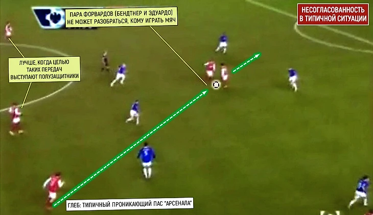 В рамках коммуникации возникали и недопонимания – по двум причинам. Первая – не разобрались с адресатом передачи, поэтому важно было рассредоточиваться грамотно. Здесь пас Глеба проходит между форвардами, Адебайором и Эдуардо, своеобразный глюк системы: