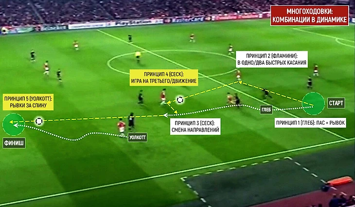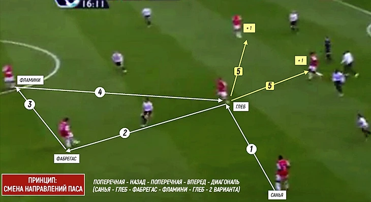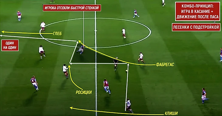 Первый принцип: пас + рывок от Глеба (pass-and-move). Второй: игра в касание, от Фламини. Третий и четвертый: смена направления и длины передач + игра на третьего/текущий рывок от Фабрегаса. Пятый: атака пространства за спинами (Уолкотт). И это не красота ради красоты, а голевая комбинация, построенная со своей половины. Вердикт английского комментатора: «Football from paradise» («Футбол из рая»).