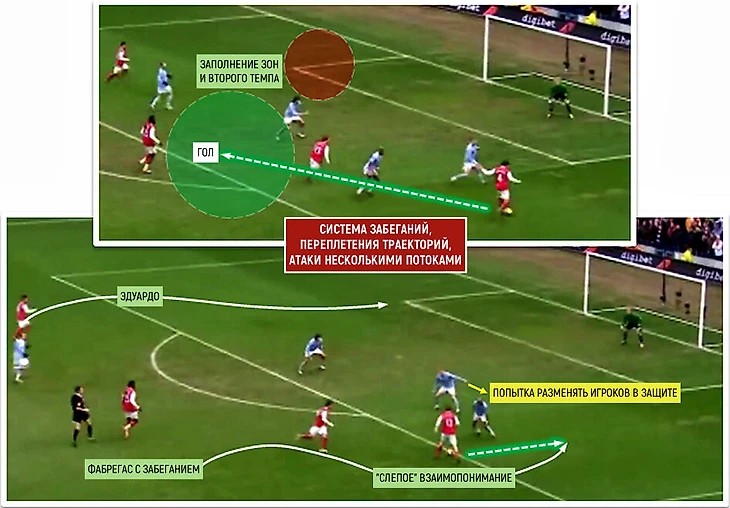 В общем, «Арсеналу» не очень нравилось, когда его атакующие принципы заимствовались соперником и оборачивались против него самого. Десятки копий и вариаций указанной выше комбинации за авторством Фабрегаса и Адебайора можно было увидеть в исполнении команды Венгера в том сезоне.