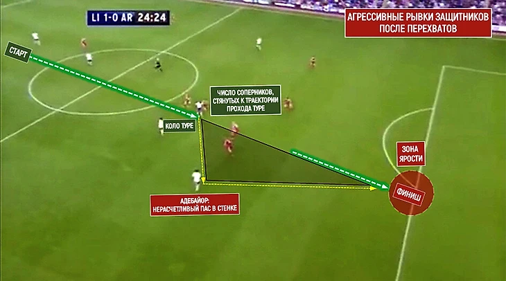 Еще две детали ситуации: сопернику необходимо как можно активнее перекрывать пространство перед мячом (им владеет Клиши), а также учитывать вариант длинного паса на Адебайора за спину (по линии заброса «Клиши-форварды» прошли несколько голевых передач за сезон).