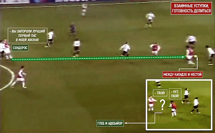 В юриспруденции подобное назвали бы уступкой права, в футболе – джентльменством от Глеба, который решил пропустить мяч, и Адебайора (не ожидал). Намерения благие, но результат – неожиданный «сквозняк», никого не коснувшийся хоккейный проброс, который проходит не только между игроками «Арсенала», но и парой центральных защитников соперника (Неста/Каладзе).