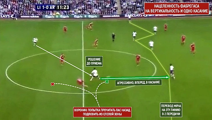 Испанец всегда был настроен агрессивно вертикализировать игру. Здесь Андрей Воронин пытается просчитать Фабрегаса, подкараулив мягкий пас назад, стартовав у него из-за спины – тщетно, потому что Сеск играет жесткой вертикальной передачей в касание: