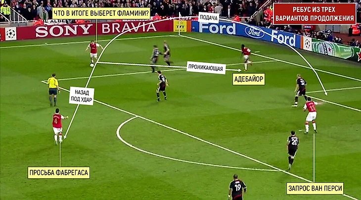 Описав принципы, по которым функционировала та команда, предлагаем вам ребус. Дано – Фламини с мячом, есть три варианта с различным типом передач и несколькими адресатами: