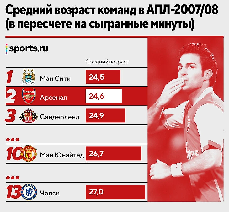 Психологические проблемы после обидной осечки – признак более широкой проблемы. «Арсенал» был в разы моложе основных конкурентов. В АПЛ была лишь одна более молодая команда – «Ман Сити» (тогда середняк):