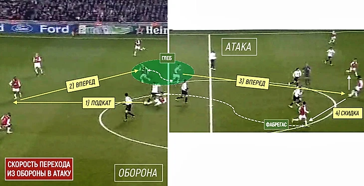 Эти простейшие вещи в построении атак порой недооценивают. Указания партнерам, сверку дистанций, предоценку позиции, но в «Арсенале» этим нюансам уделялось большое внимание. Смотрите, они сначала передают взгляд – и только потом мяч: