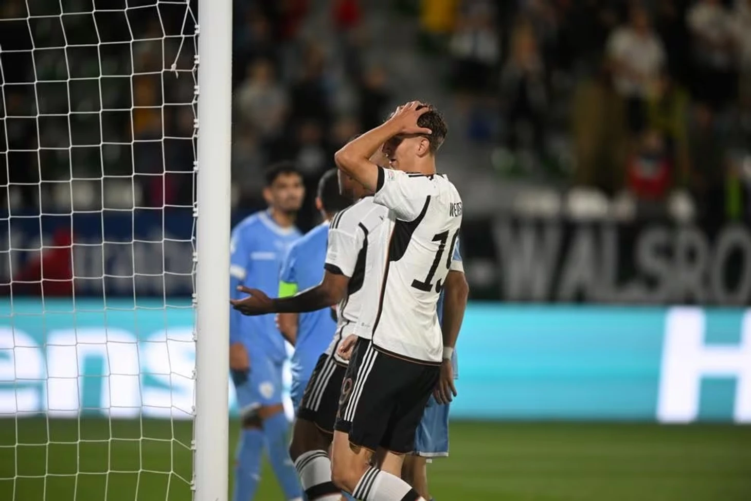 Уже через 6 минут капитан сборной Германии реабилитировался. Защитник ловко подстроился под навес со штрафного Анджело Штиллера и головой сравнял счёт. В самом конце первого тайма Эден Карцев получил вторую жёлтую карточку и оставил команду Израиля в меньшинстве.