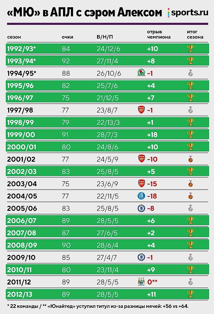 Также стоит отметить его преданность «МЮ», ведь это редчайшее умение – провести столько лет в одном клубе и иметь такие невероятные достижения. Команда, несмотря на смену чемпионов, травмы и другие события, была невероятно стабильной в эпоху АПЛ.